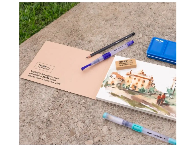 Bloc de dibujo A6 para acuarela con 30 hojas.Papel de alta calidad libre de ácido, prensado en frío y libre de cloro. Gramaje de 300 g/m² con un 25% de algodón que ofrece una gran absorción y resistencia, y mantiene los colores vibrantes. Color blanco natural y textura de grano fino. Ideal para artistas de todos los niveles. Gran versatilidad para técnicas secas y húmedas y aplicaciones mixtas, como acuarelas, acrílicos, gouache, lápices de colores y grafito, carboncillos, pasteles, plumas de tinta y rotuladores. Las hojas están encoladas en un borde lateral y se separan fácilmente. Tapa blanda y cubierta trasera dura para mayor estabilidad y protección. Apertura plana. Cinta de goma que mantiene el bloque cerrado para proteger su contenido. Tamaño práctico y fácil de transportar para poder pintar en cualquier lugar y llevar en viajes. Inspirado en los colores y diseño original de la goma de borrar profesional MILAN 1420 the Master Gum. Medidas: 14,8 x 10,5 x 2,16 cm. Peso: 0,19 kg.