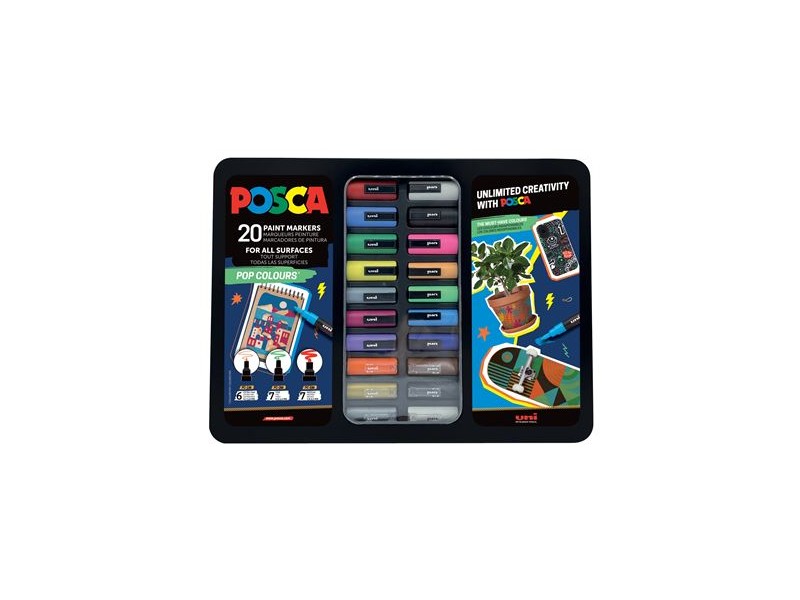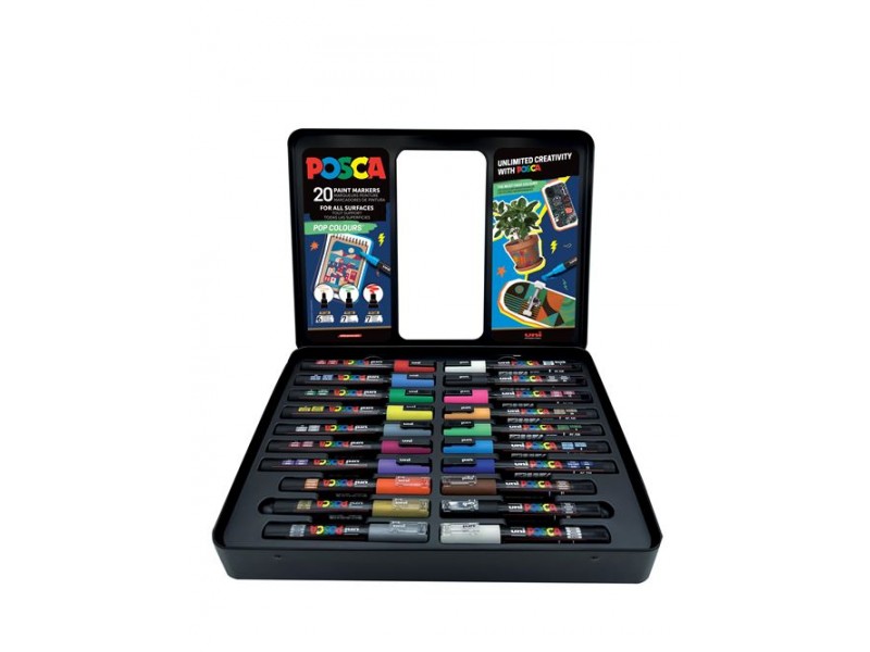 Esta maleta metálica contiene 20 rotuladores de diferentes tonalidades, perfectos para todo tipo de superficies, como papel, cartón, tela, madera e incluso materiales plásticos. Los rotuladores UNI POSCA son conocidos por su facilidad de uso y su capacidad de crear efectos artísticos únicos.